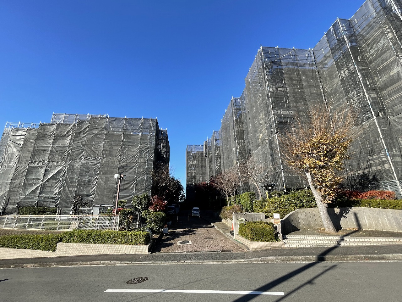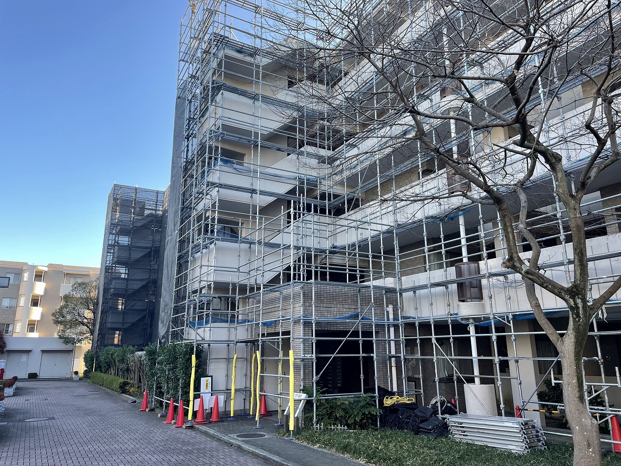 第2回目の大規模修繕工事が11月から始まりました。先行する7・8番館では、工事用の足場が組みあがり、外壁などの下地調査が始まっています。12月には9~11番館、1月には1~3番館…と順番に足場が架かっていきます。